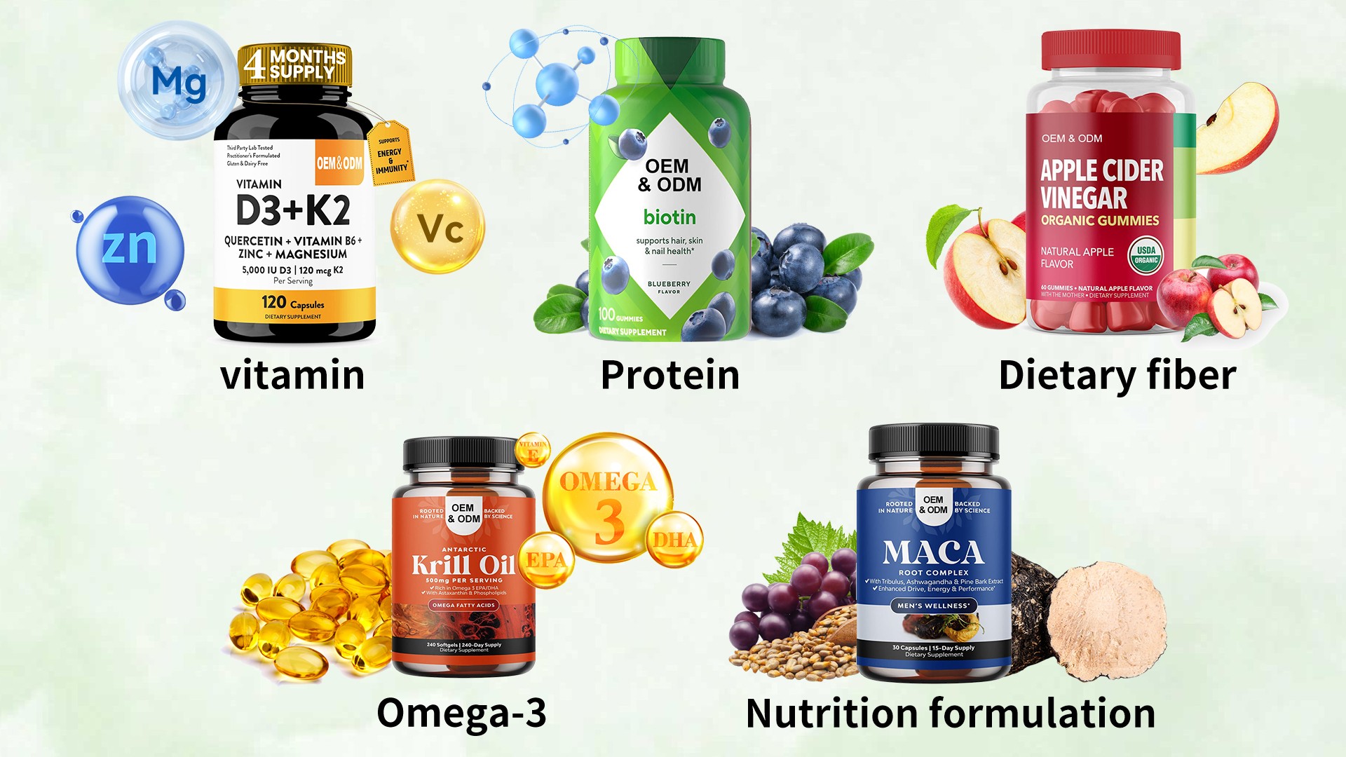 Protein Supplements: Including whey protein and soy protein, used to aid post-surgery recovery, maintain muscle mass in the elderly, and support muscle growth for fitness enthusiasts.